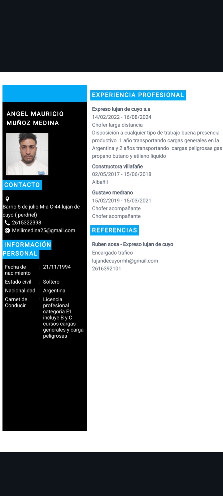 Chofer professional larga distancia 3 años en expreso lujan de cuyo transportando carga genereles y peligrosas