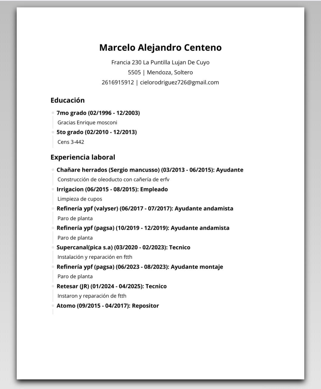 - Lugar de residencia actual : Lujan de cuyo