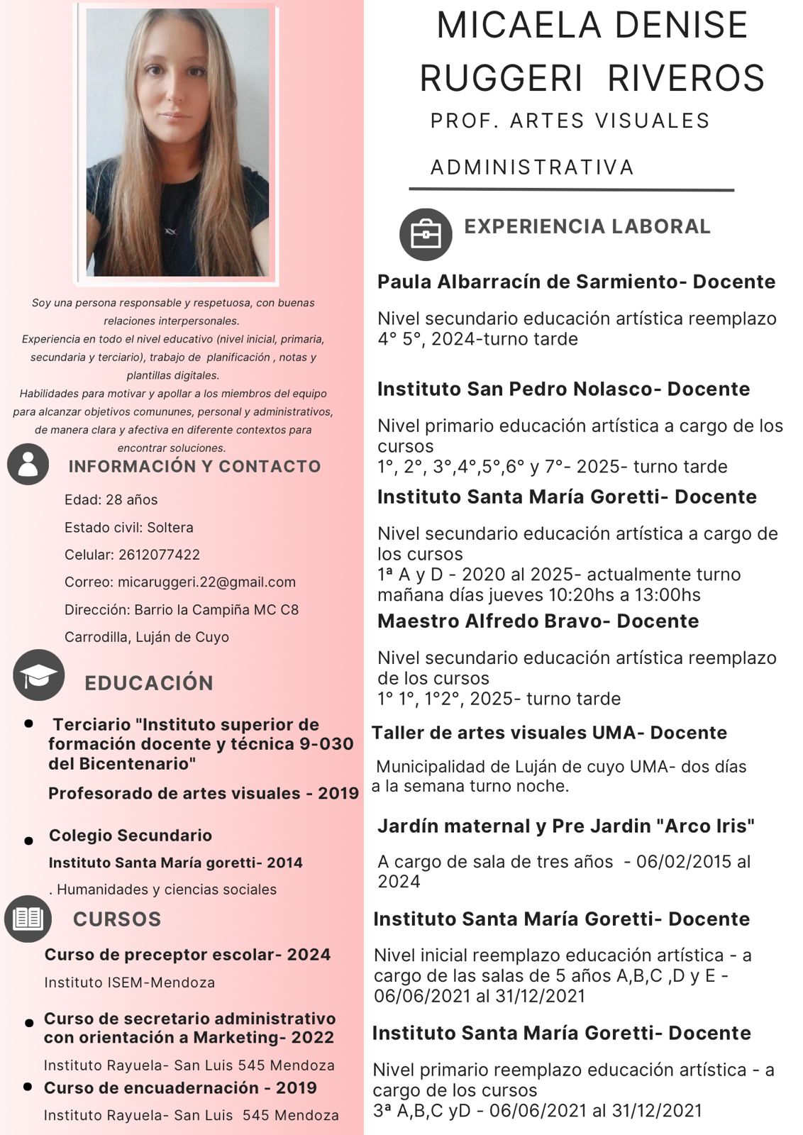 Docente de artes visuales, taller de artes visuales, atención al público, auxiliar jardin maternal, preceptora, secretaria administrativa
